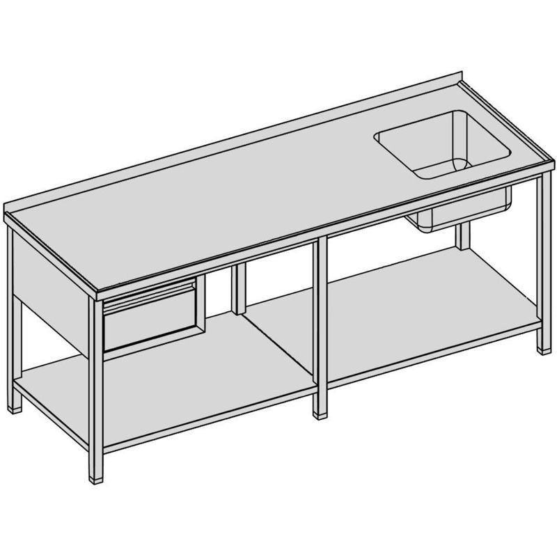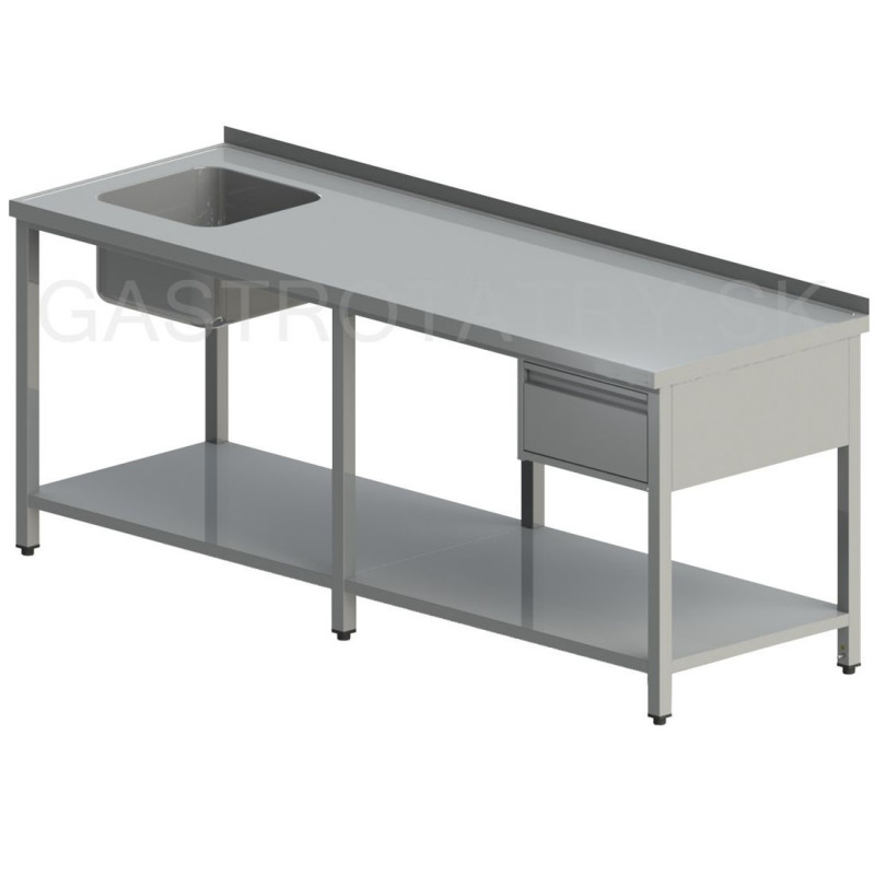 Umývací stôl so zásuvkou a policou dlhý, hĺbka 600, 700, 800 mm, šírka 2000 - 2800 mm, výška stola štandardne 850 mm ▪ možnosť vyhotovenia bez zadného lemu ▪ vrch police 150 mm od zeme ▪ nosnosť police 50 kg ▪ 1x zásuvka