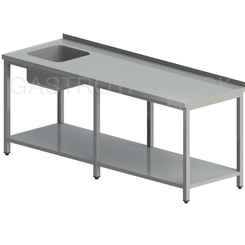 Umývací stôl s drezom a policou dlhý, hĺbka 600, 700, 800 mm, šírka 2000 - 2800 mm, výška stola štandardne 850 mm ▪ bez lemu ▪ vrch police 150 mm od zeme ▪ nosnosť police 50 kg. Drez lisovaný 400x400x250 mm, bez otvoru na batériu