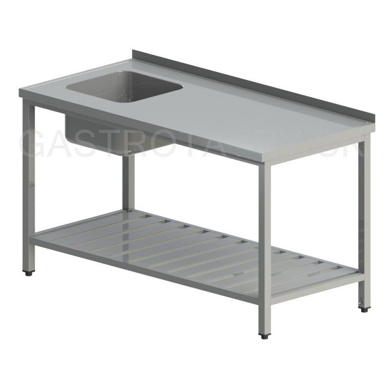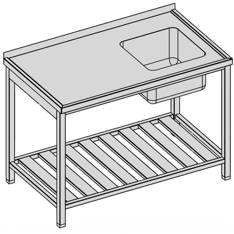 Umývací stôl s drezom a roštovou policou, hĺbka 600, 700, 800 mm, výška stola štandardne 850 mm ▪ bez lemu ▪ roštová polica ▪ vrch police 150 mm od zeme ▪ nosnosť police 50 kg. Drez lisovaný 400x400x250 mm, bez otvoru na batériu