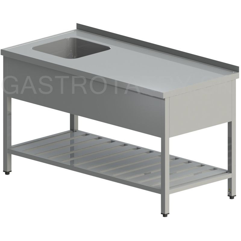 Umývací stôl s krytým drezom a roštovou policou, hĺbka 600, 700, 800 mm, šírka 800 - 1900 mm, výška stola štandardne 850 mm ▪ možnosť vyhotovenia bez zadného lemu ▪ roštová polica ▪ vrch police 150 mm od zeme ▪ nosnosť police 50 kg ▪ krytovanie