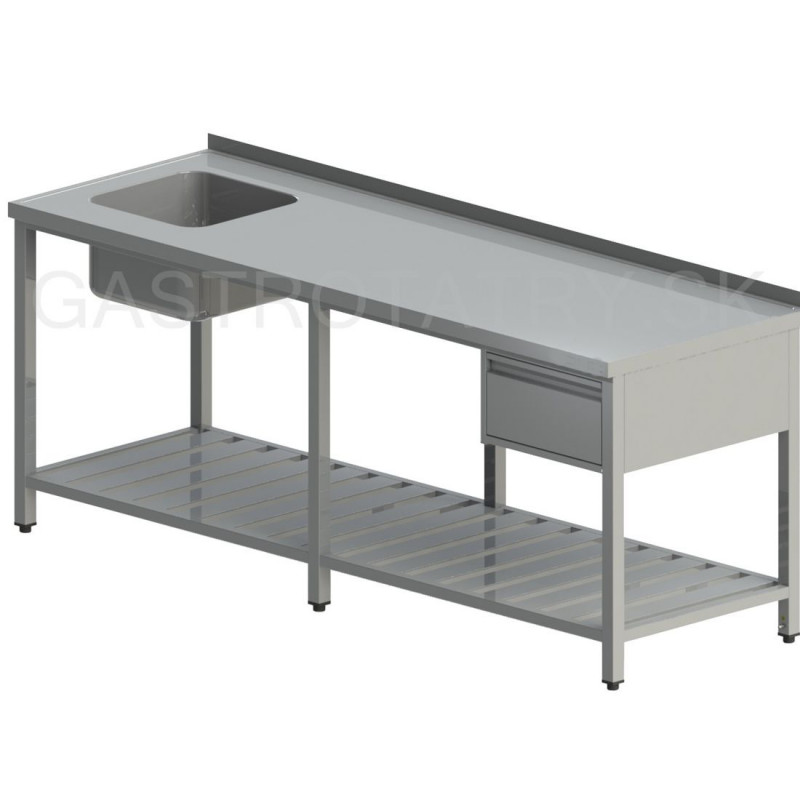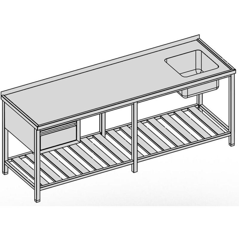 Umývací stôl so zásuvkou a roštovou policou dlhý, hĺbka 600, 700, 800 mm, šírka 2000 - 2800 mm, výška stola štandardne 850 mm ▪ možnosť vyhotovenia bez zadného lemu ▪ roštová polica ▪ vrch police 150 mm od zeme ▪ nosnosť police 50 kg ▪ 1x zásuvka