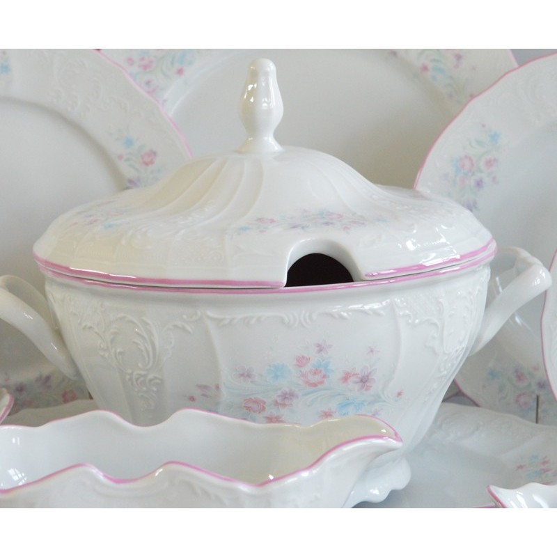 Obsahuje: 1x misa polievková s vekom 2,5 l, 1x omáčnik s podšálkou, 1x misa kompótová 25 cm, 1x misa kompótová 23 cm, 1x misa oválna 34 cm, 1x misa plytká 30 cm, 6x tanier plytký 25 cm, 6x tanier hlboký 23 cm, 6x tanier dezertný 19 cm, 1x soľnička-korenička 2 dielna
