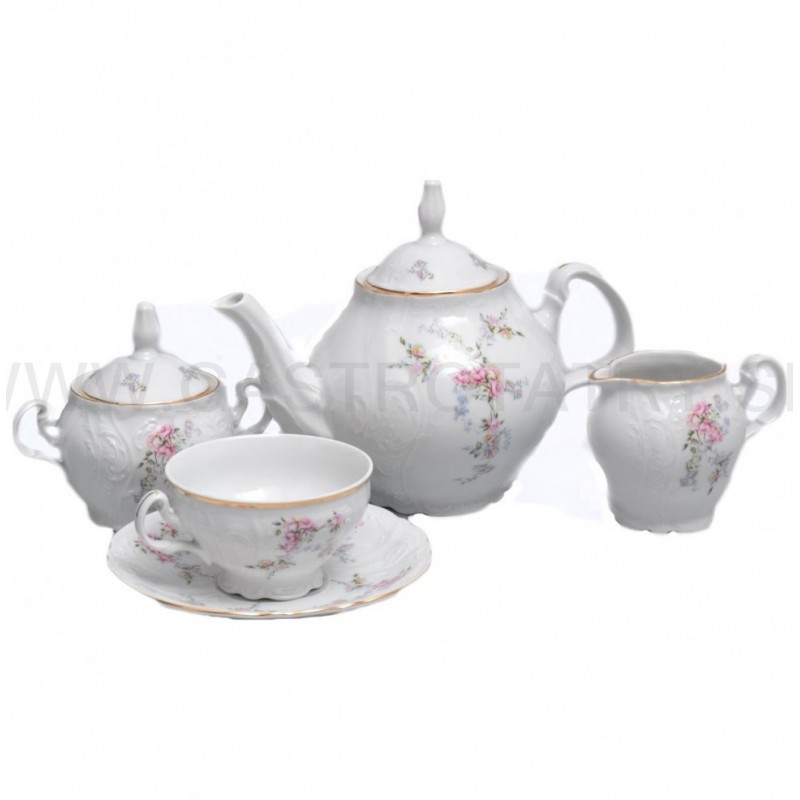Karlovarský porcelán BERNADOTTE Jemné ružové kvety + zlatá linka biela 17 D čajová súprava.