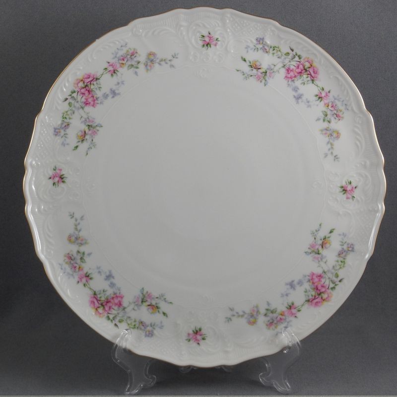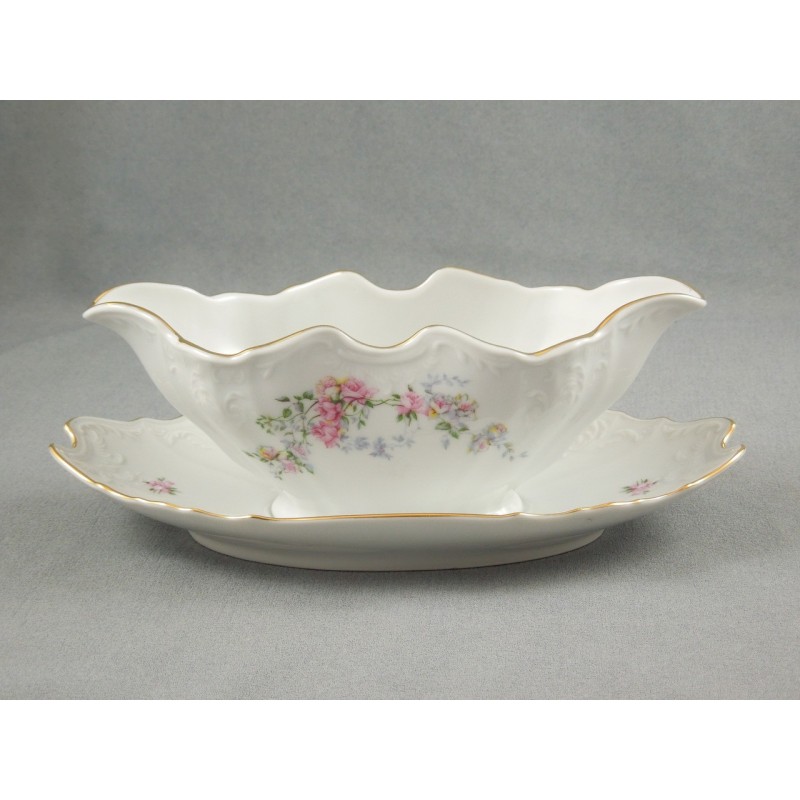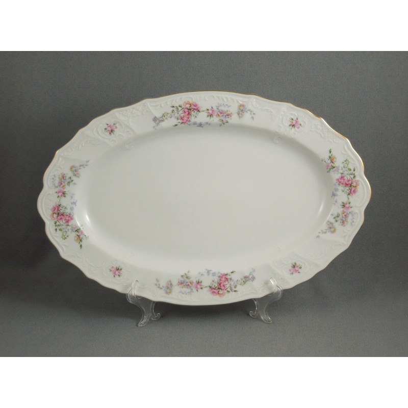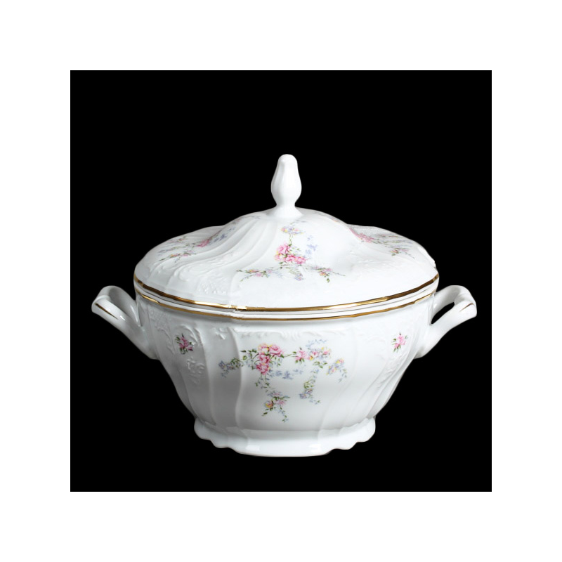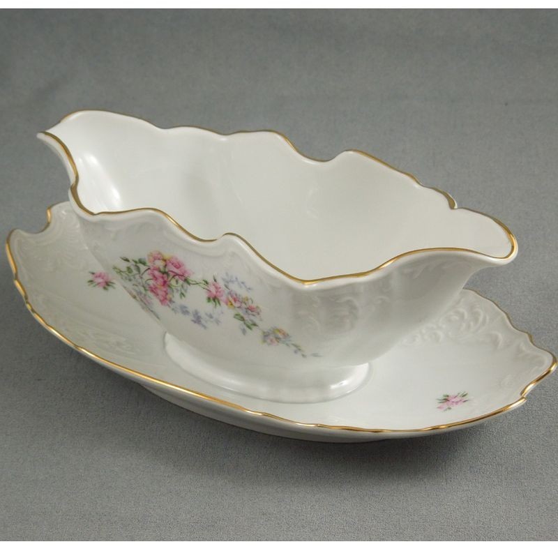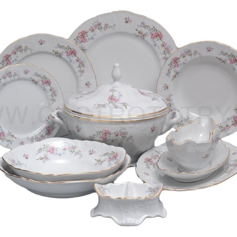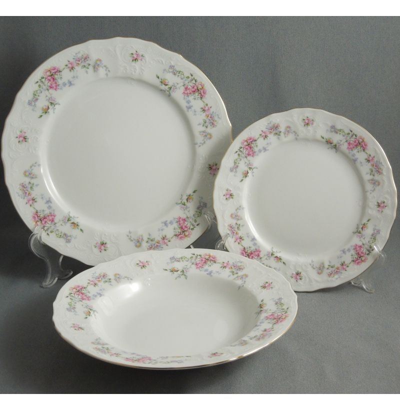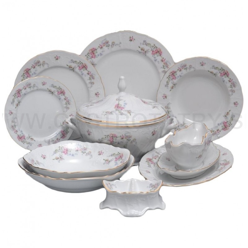 Karlovarský porcelán BERNADOTTE Jemné ružové kvety + zlatá linka biela 26D obedová súprava.