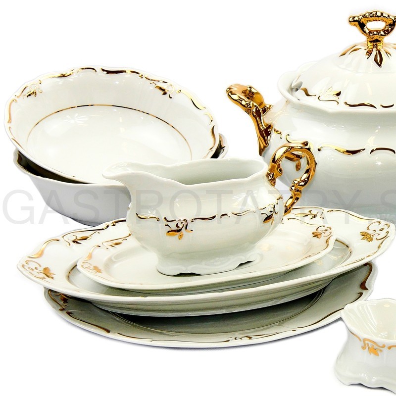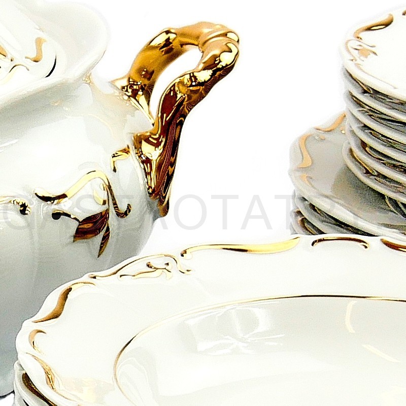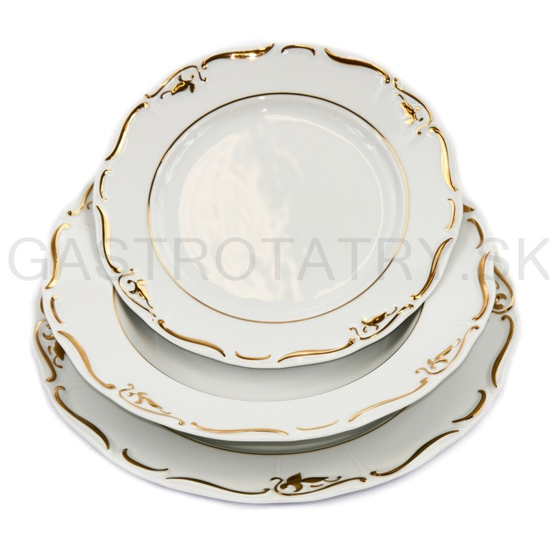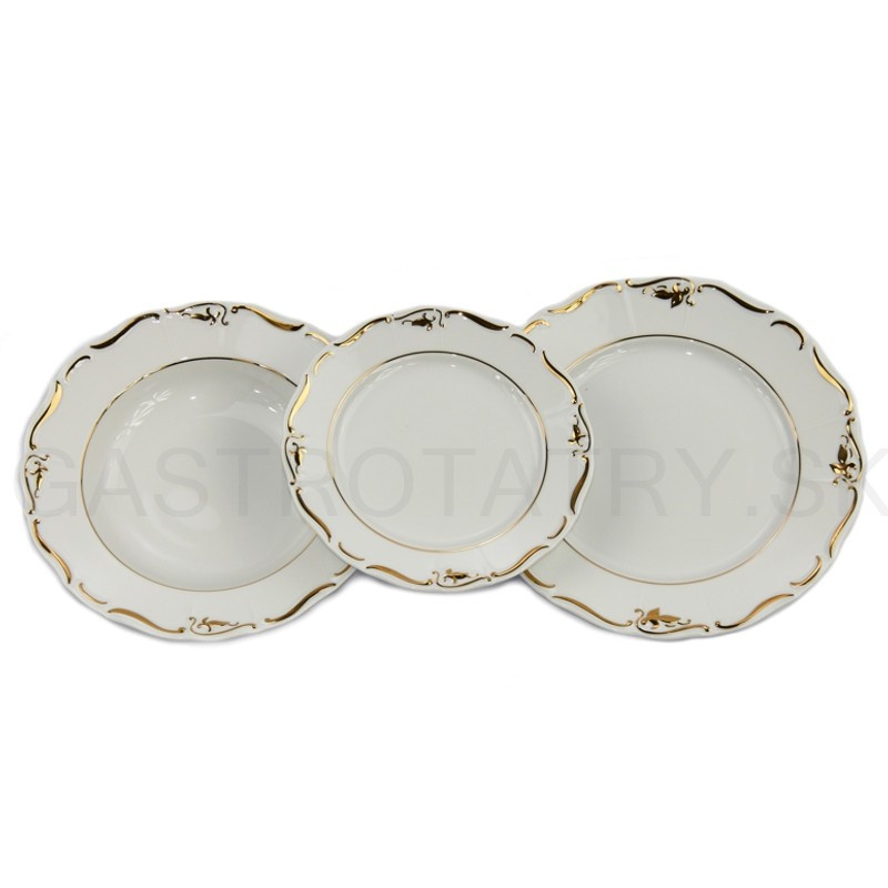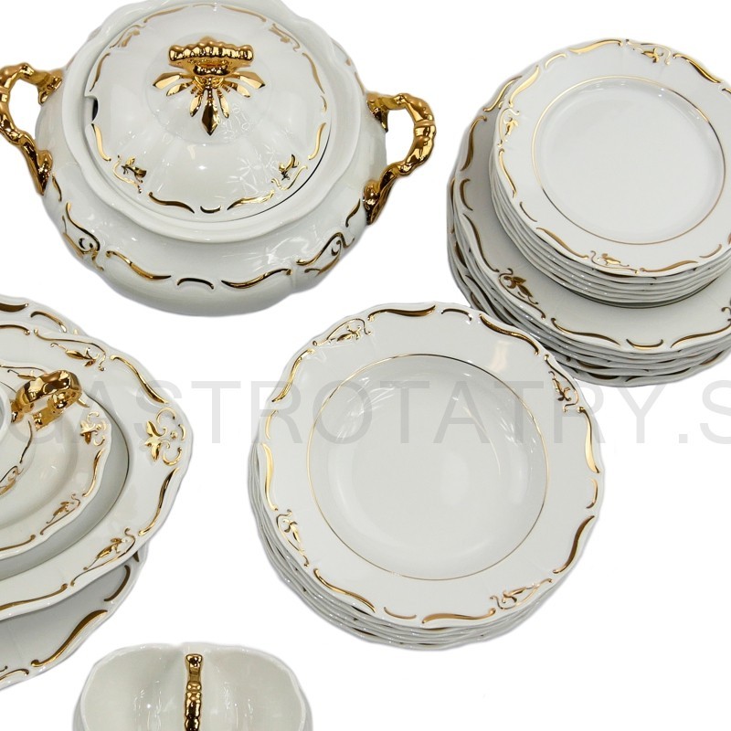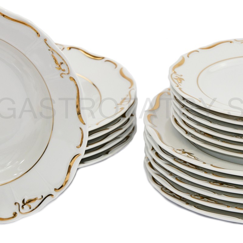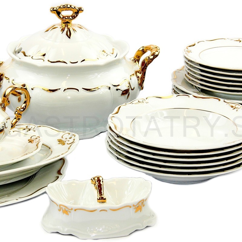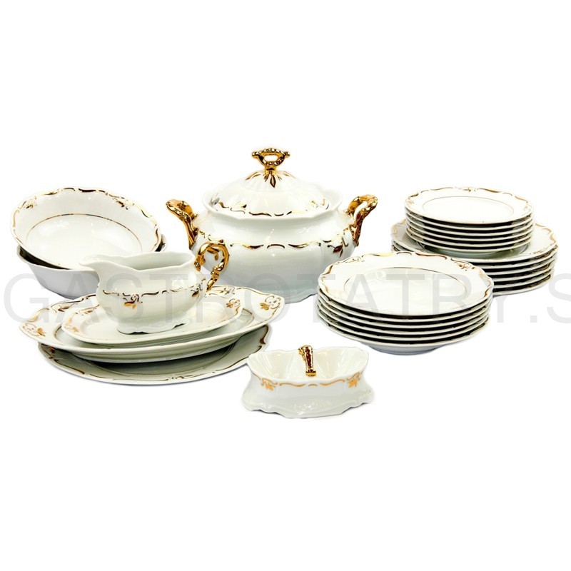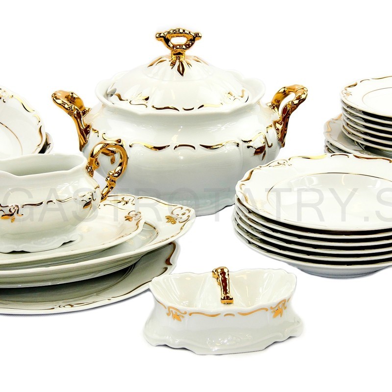 Karlovarský porcelán Maria Louise - Jemný zlatý ornament - obedová súprava 27 D, nie je vhodná do mikrovlnej rúry a umývačky riadu.