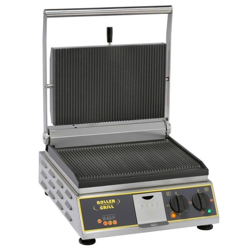 Zariadenie s vrúbkovanými liatinovými platňami so smaltovanou povrchovou úpravou s rozmermi 360 x 240 mm na grilovanie mäsa, rýb, klobás, sendvičov, bagiet, zapekaných toastov a pod. s výnimočnými vlastnosťami a ľahkým čistením. Termostat s regulovaným nastavením teploty 0-300 ºC. Zásuvka v prednej časti na zachytávanie mastnoty. Komutátor na prepínanie ohrevu - spodná platňa, horná platňa, obe platne. Smaltované vrúbkované platne s rýchlym nábehom pracovnej teploty: 280 °C za 8 min. a 30 sekúnd. Rovnomerná teplota po celej ploche vďaka zabudovaným telesám v platniach. Horná platňa s vyvažovaním. Integrovaný časový spínač.