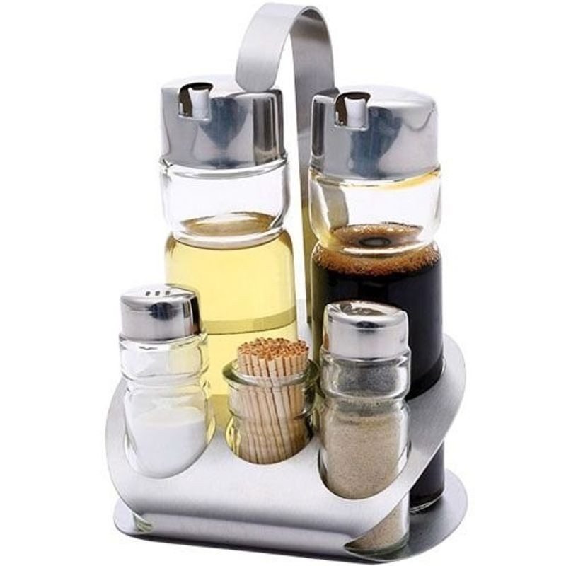 Koreničky nerezové, satinované - soľ, korenie, olej, ocot a nádobka na špáradlá, výška 18,5 cm, šírka 11 cm, dĺžka 13 cm