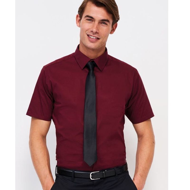 Pánska strečová košeľa s krátkym rukávom, priliehavý strih, golier s jedným gombíkom, zapínanie na gombíky tón v tóne. Materiál: 97% bavlna, 3% elastan. (BROADWAY)