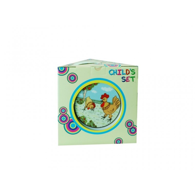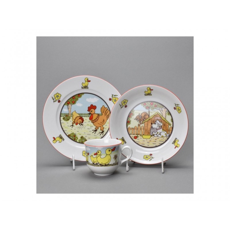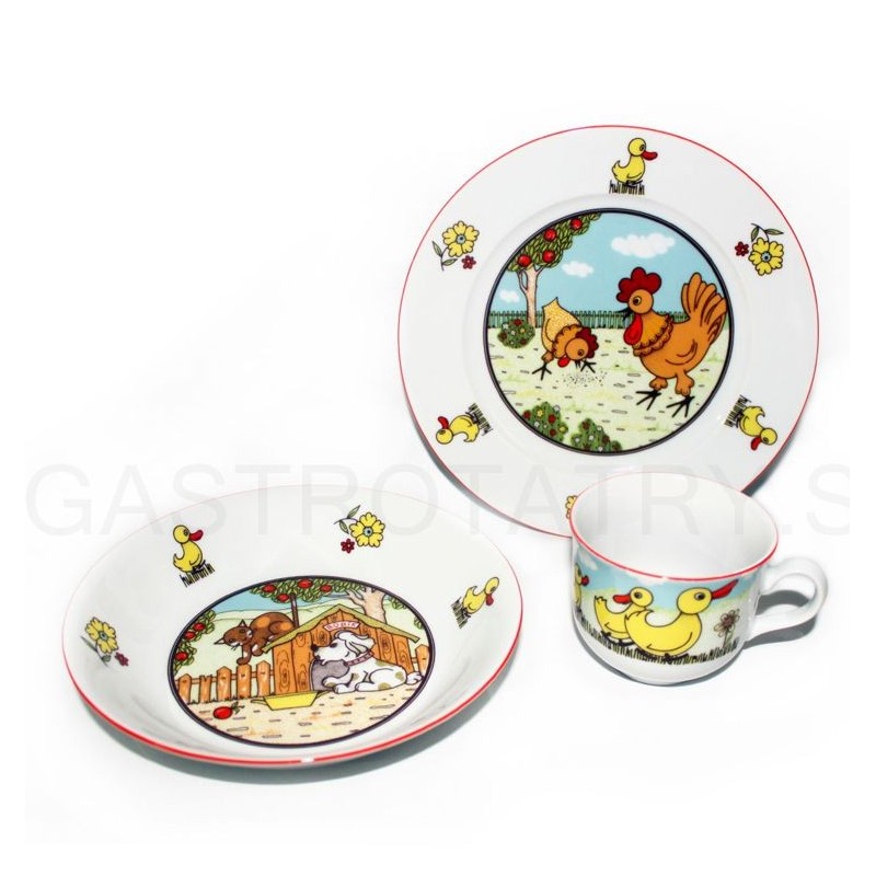 Detská súprava 3 diely - zvieratka na dvorčeku Angelika. Obsahuje: 1 x tanier plytký 21 cm, 1 x tanier hlboký 19 cm, 1 x hrnček 225 ml