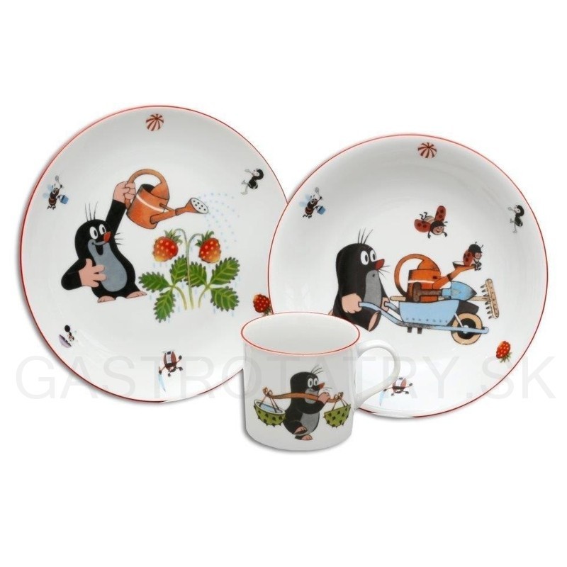 Krtko detská SP 3D fúrik + jahody 3D CAIRO. Obsahuje: 1 x tanier plytký 21 cm, 1 x tanier hlboký 19 cm, 1 x hrnček 225 ml
