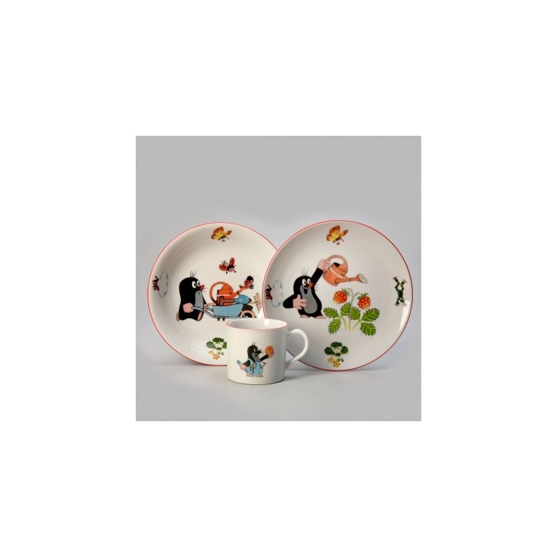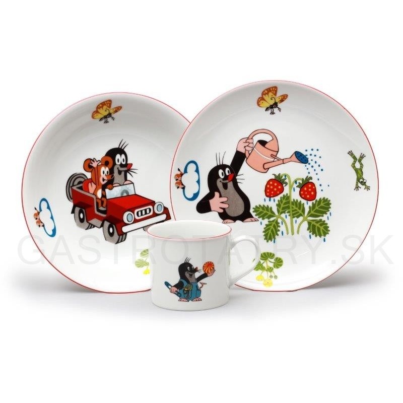 Krtko detská SP 3D majster a auto + jahody 3D CAIRO. Obsahuje: 1 x tanier plytký 21 cm, 1 x tanier hlboký 20 cm, 1 x hrnček 250 ml
