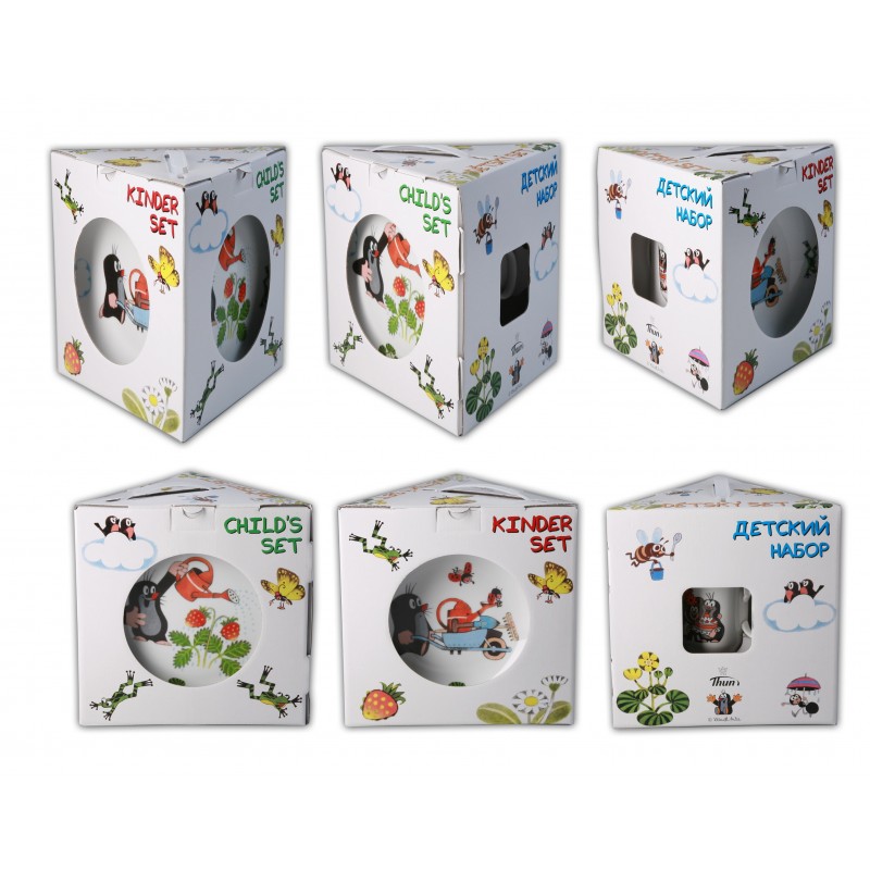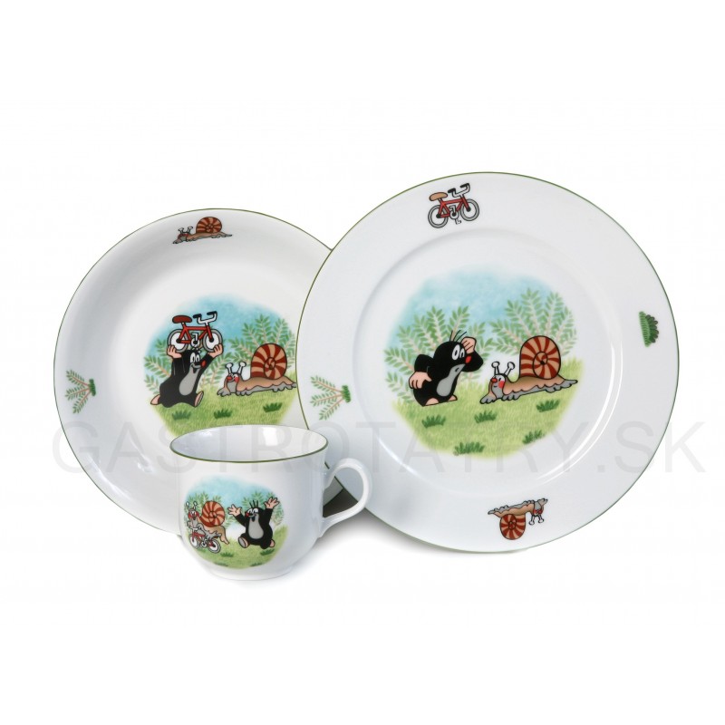 Krtko detská súprava 3 diely - slimák Angelika. Obsahuje: 1 x tanier plytký 21 cm, 1 x tanier hlboký 19 cm, 1 x hrnček 225 ml