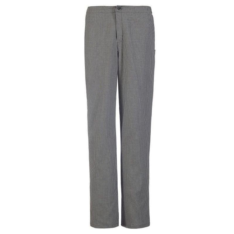 Pepitové nohavice s dvomi bočnými vreckami. Pánske kuchárske nohavice, sťahovacie gombíky vzadu, vytkávaný vzor pepito, 2 bočné vrecká, 100% bavlna, pranie na 60°C.