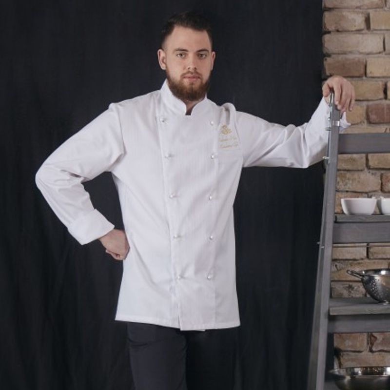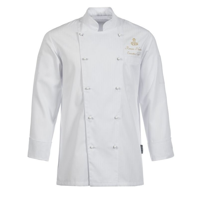 Tento rondón je vskutku elegantným kúskom. Prúžkovaný materiál má jemný saténový lesk a dodá eleganciu každému kuchárovi. Je vhodné doplniť ho výšivkou mena a loga. Príplatok za výšivku je 4,70 €