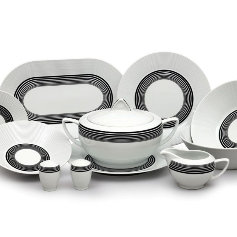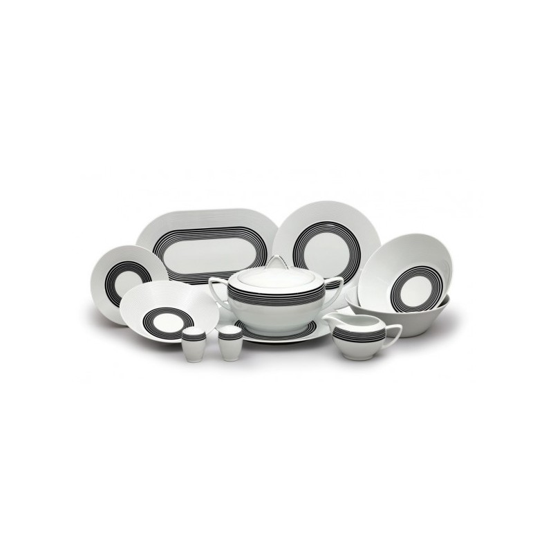 Karlovarský porcelán - Lea obedná súprava 27 dielov. Zloženie: 6 x tanier hlboký 22 cm, 6 x tanier plytký 27 cm, 6 x tanier dezertný 19 cm, 1 x tanier plytký 30 cm, 2 x misa kompótová 24 cm, misa polievková 2,70 l s viečkom, guľatý omáčnik 0,4 l, 1 x misa oválna 38 cm, soľnička zavretá, korenička uzavretá.