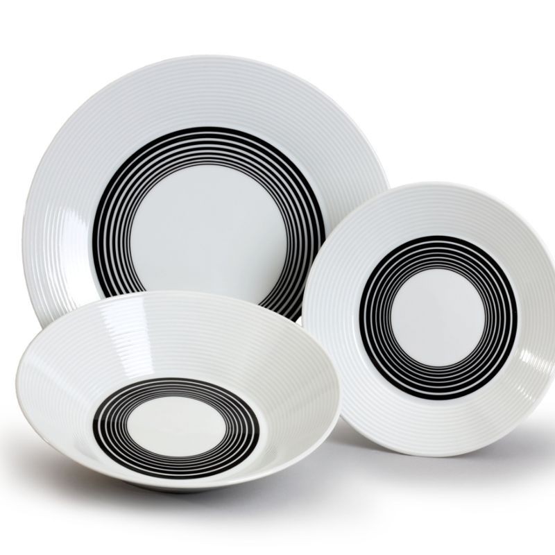 Karlovarský porcelán Lea tanierová súprava 18 dielov - čierne pruhy. Tanierová súprava obsahuje: 6x tanier plytký 27 cm, 6x tanier hlboký 22 cm, 6x tanier dezertný 19 cm.