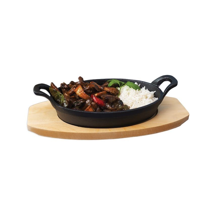 Liatinová panvica s drevenou doskou 21x15 cm - galvanizovaný povrch, vhodné aj na indukciu - oválne prevedenie, objem 0,8 l - rozmery 21 x 15 x 7,5 cm