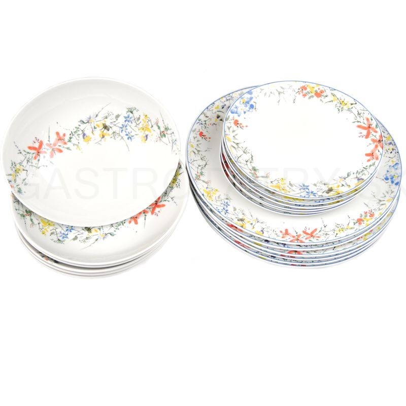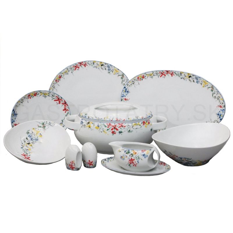 Obsahuje: 1x misa polievková s pokrievkou 3,2 l, 1x omáčnik s tanierikom 400 ml, 1x misa kompótová 27 cm, 1x misa oválná 36 cm, 6x tanier plytký 30 cm, 6x tanier hlboký 23 cm, 6x tanier dezertný 21 cm, 1x soľnička, 1x korenička