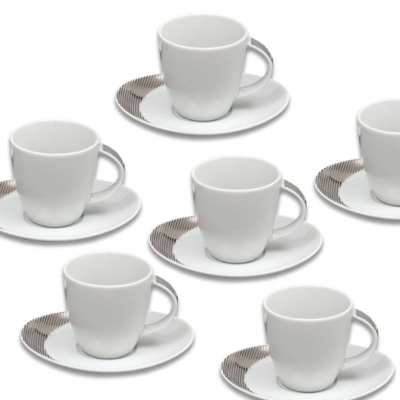 ŠAPO šálky s podšálkami vysoké 140 LOOS platinový dekor. Obsahuje: 6x šálka, priemer: 71 mm, výška: 70 mm, objem: 150 ml, 6x podšálka 140, výška: 21 mm, dlžka: 140 mm, šířka: 114 mm