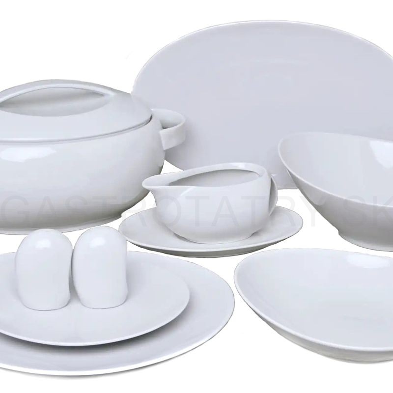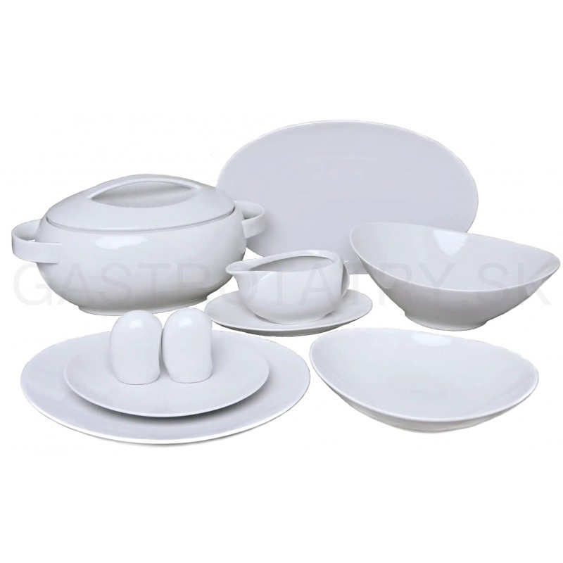 Obsahuje: 1x misa polievková s pokrievkou 3,2 l, 1x omáčnik s tanierikom 400 ml, 1x misa kompótová 27 cm, 1x misa oválná 36 cm, 6x tanier plytký 30 cm, 6x tanier hlboký 23 cm, 6x tanier dezertný 21 cm, 1x soľnička, 1x korenička