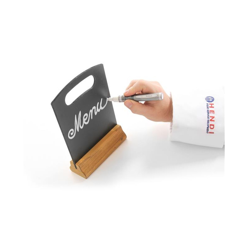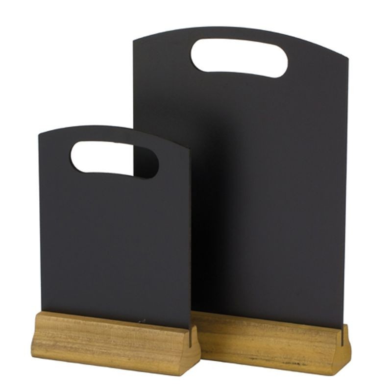 Stolová tabuľa 15 x 23 cm. 2 ks v balení. Čierna, s dreveným podstavcom. Cena za balenie.