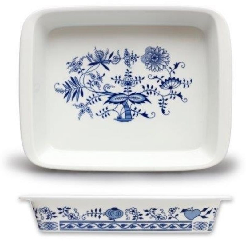 Misa zapekacia obdĺžniková - cibulák 31, je vhodná do mikrovlnnej rúry a umývačky riadu. Výška: 50 mm, dĺžka: 315 mm, šírka: 245 mm. Karlovarský porcelán THUN 1794.