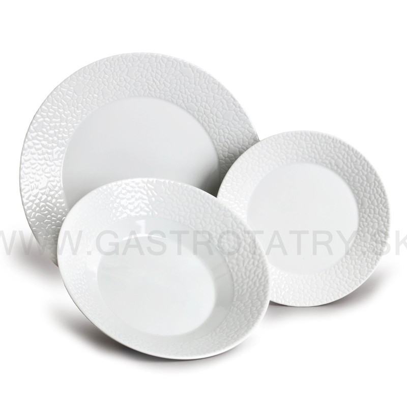 Karlovarský porcelán - MOSAIC Tanierová súprava 18 dielna biela. Tanierová súprava obsahuje: 6x tanier plytký 27 cm, 6x tanier hlboký 22 cm, 6x tanier dezertný 19 cm.