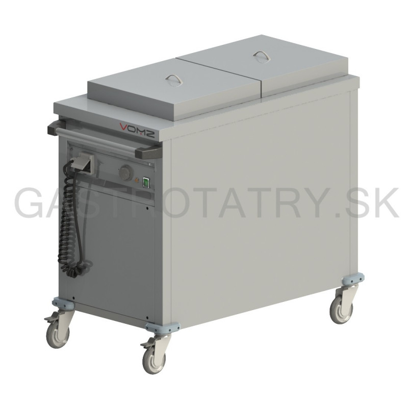 Ohrievací vozík tanierov 2 x max. priemer taniera 290 mm, rozmery (šxh) 450x900 mm, príkon 1,4 kW, napätie 230 V, výška vozíka štandardne 850 mm. Kolieska: - Priemer kolieska Ø100 mm - Výška kolieska 135 mm - Behúň – gumová obruč - 2x brzdené - S rozpernou vložkou do profilu - Nosnosť 100 kg