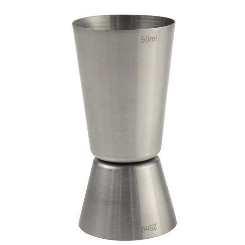 Barmanská mierka - jigger 25/50 ml, BarUp, ⌀ 43 mm x (výška) 85 mm. Vyrobené z nehrdzavejúcej ocele s matným povrchom. Kapacita: 25/50 ml. Vhodné do umývačky riadu.