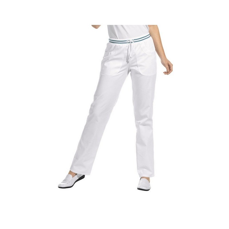 Dámske biele nohavice rovného strihu 08/6750, s malinovým alebo tyrkysovými doplnkami, 2 bočné vrecká, s farebnými doplnkami. Materiál: 65 % PES 35 % BA.
