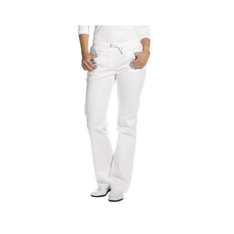 Dámske biele nohavice s elastickým pásom 08/6830, rovný strih, bočné vrecka, so šnúrkou v páse. Materiál: 97 % BA 3 % elastan.