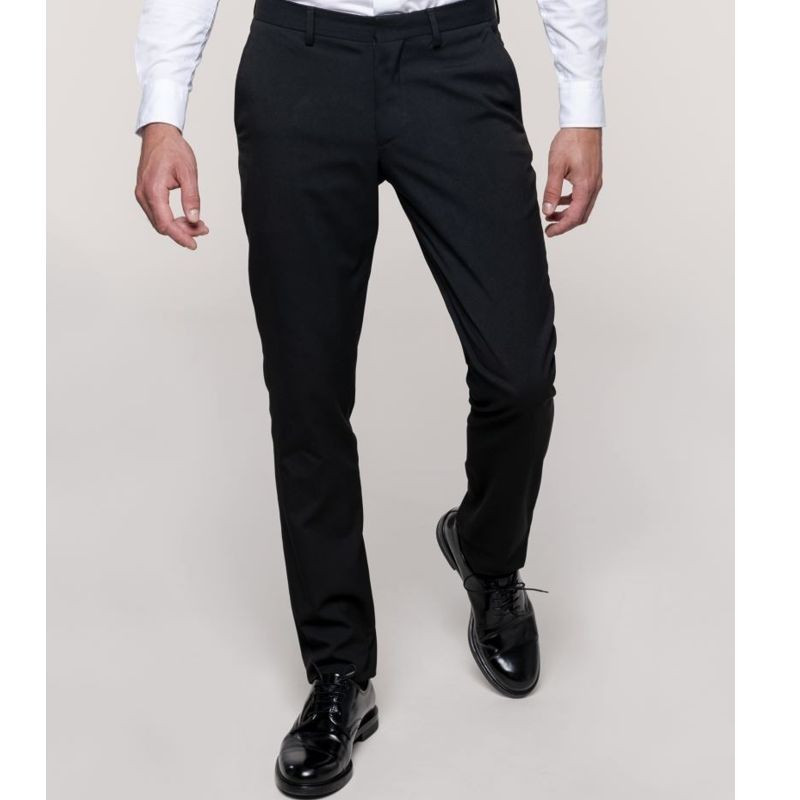 Pánske strečové slim-fit nohavice. Úzke nohavice, 2 predné talianske vrecká, pútka na opasok. Materiál: 220g/m², 64% polyester, 34% viskóza, 2% elastan. Vyberte si veľkosť podľa našich tabuliek, nohavice budú mať vysačku podľa nasledovnej škály:
