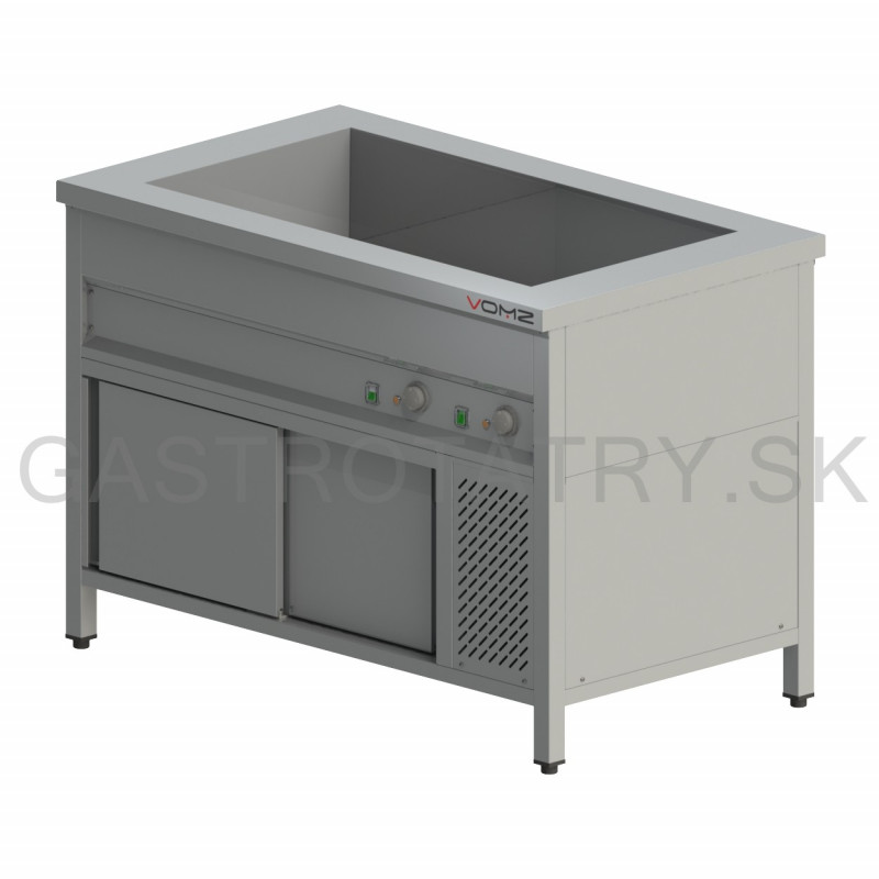 Výdajný ohrievací pult s režónom, hĺbka 700 mm, šírka 1200 mm, 3x GN 1/1, príkon 4,75 kW, napätie 400 V, výška pultu štandardne 850 mm ▪ zváraná vaňa ▪ priechodný variant ▪ verzia s digitálnym termostatom za príplatok. Ventil na napúšťanie a vypúšťanie vody (VOP1) ▪ Ventil na vypúšťanie vody (VOP2 – VOP5) ▪ Regulácia teploty +20 / +80 °C ▪ Hĺbka vane štandardne 220 mm