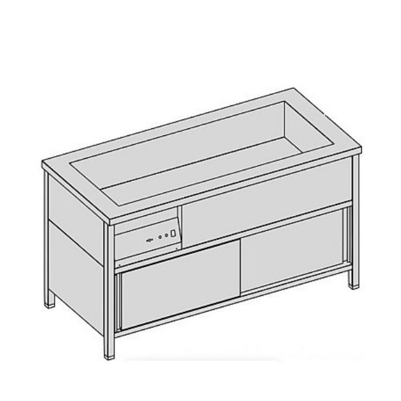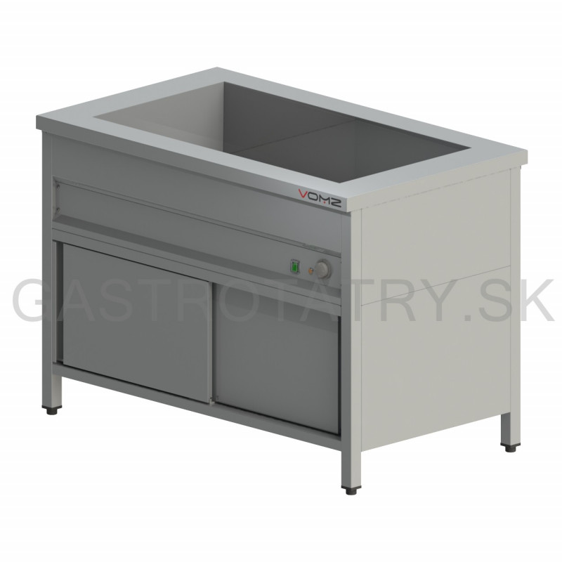 Výdajný ohrievací pult so skrinkou, hĺbka 700 mm, šírka 1200 mm, 3x GN 1/1, príkon 2,25 kW, napätie 230 V, výška pultu štandardne 850 mm ▪ zváraná vaňa ▪ verzia s digitálnym termostatom za príplatok. Ventil na napúšťanie a vypúšťanie vody (VOP1) ▪ Ventil na vypúšťanie vody (VOP2 – VOP5) ▪ Regulácia teploty +20 / +80 °C ▪ Hĺbka vane štandardne 220 mm
