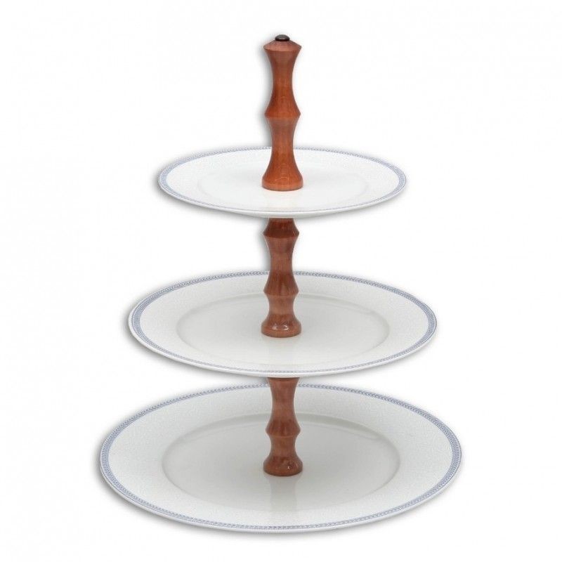 Etažerka Opál. Etažerka je trojposchodový tanier doplnený dreveným kľúčom. Vhodná do mikrovlnej rúry a umývačky riadov. Obsahuje: 1x tanier plytký 26 cm, 1x tanier plytký 21 cm, 1x tanier dezertný 17 cm. Váha:1,100 kg