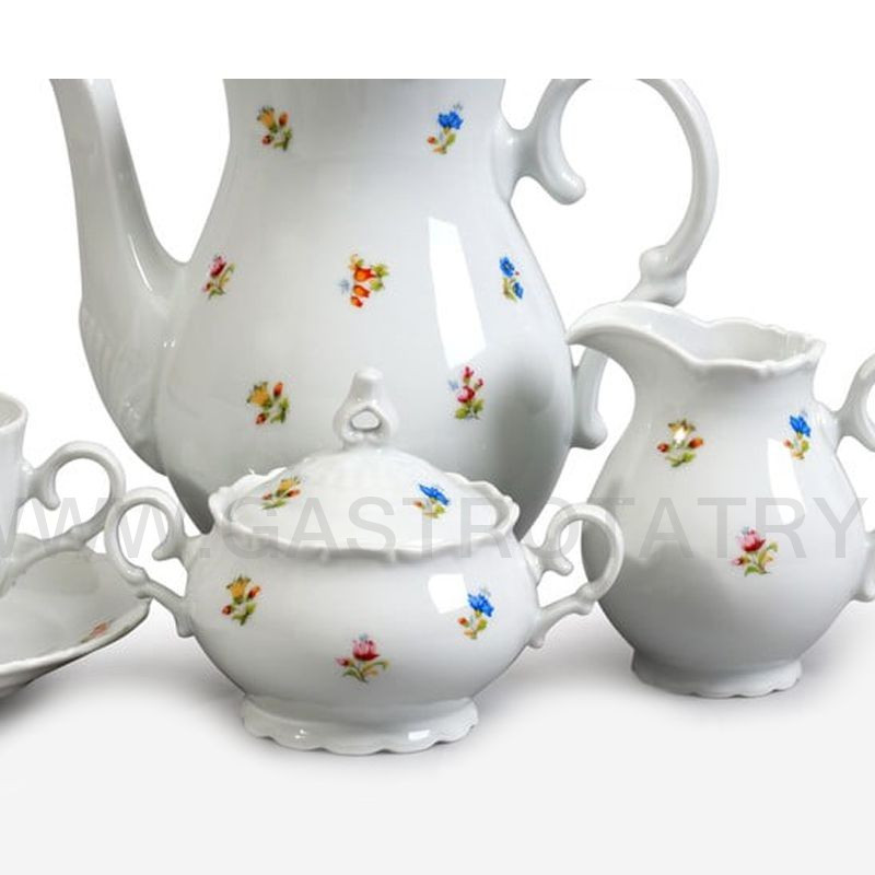 Karlovarský porcelán - Ophelia kávová súprava 17 dielov, rozhádzané kvietky. Zloženie: 6 x šálka 150 ml, 6 x tanierik 15 cm, 1 x kávová kanvica 1,2 l