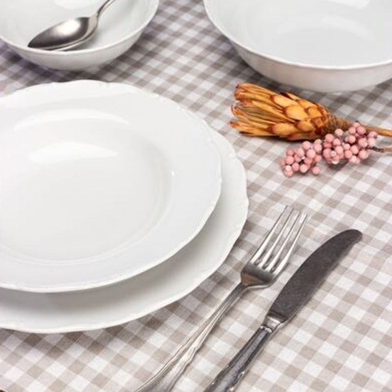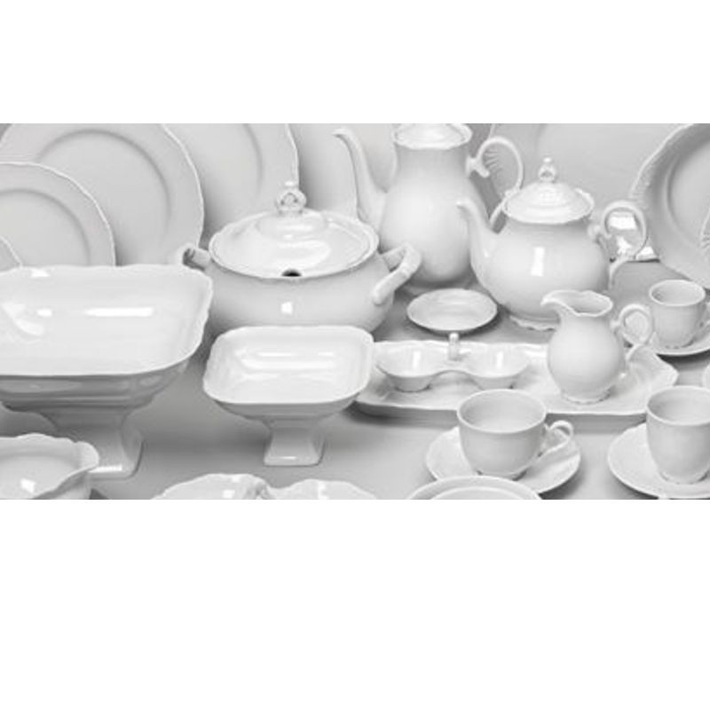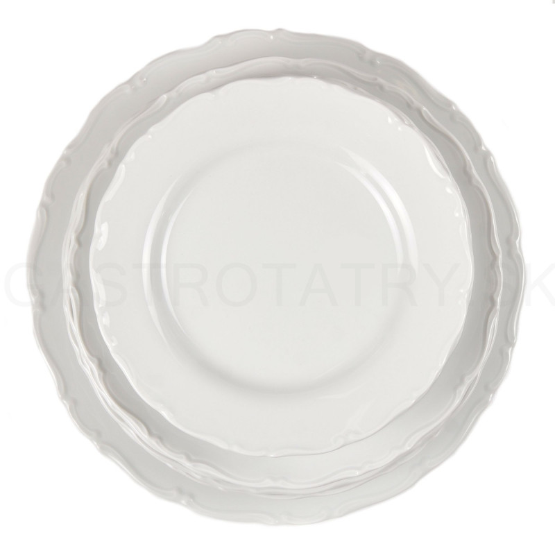 Karlovarský porcelán - Obedová súprava 27 D biela Ophelia. Obsahuje: 6 x tanier plytký 25 cm, 6 x tanier hlboký 23 cm, 6 x tanier dezertný 19 cm, 1 x misa polievková 2,3 l