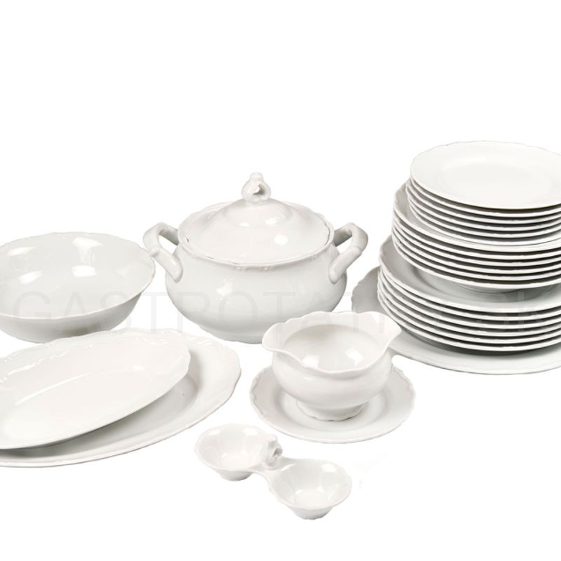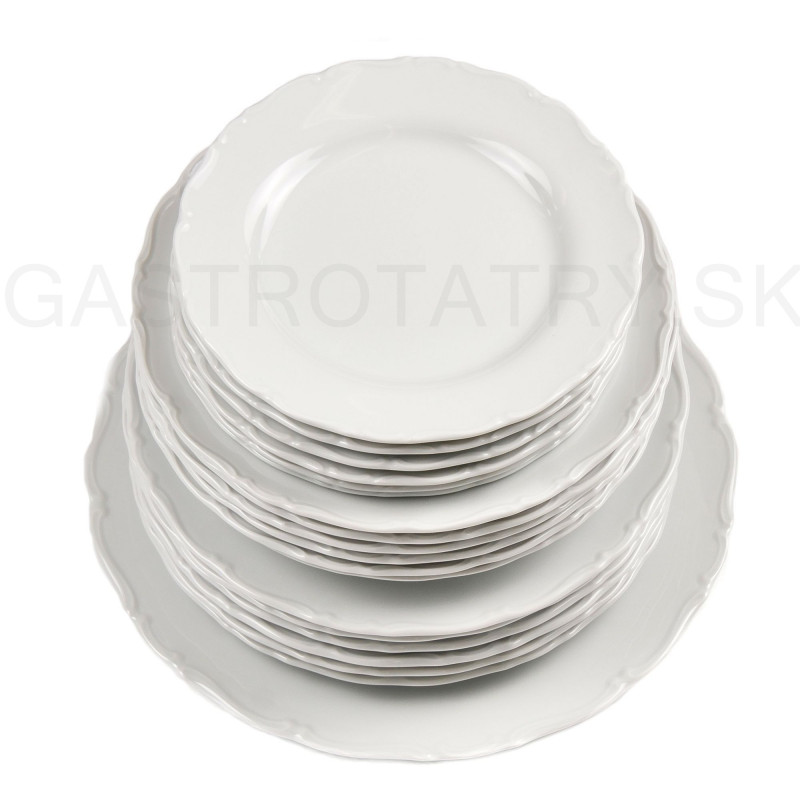 Obedová súprava 27 D biela Ophelia. Obsahuje: 6 x tanier plytký 25 cm, 6 x tanier hlboký 23 cm, 6 x tanier dezertný 19 cm, 1 x misa polievková 2,3 l