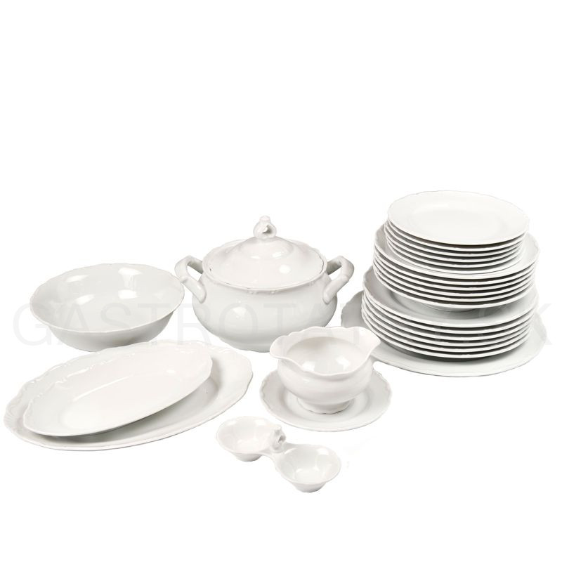 1 x veko k polievkovej mise, 1 x omáčnik 0,4 l, 1 x podšálka k omáčniku, 1 x misa kompótová 23 cm, 1 x misa oválna 26 cm, 1 x misa oválna 32 cm, 1 x misa plytká 30 cm, 1 x soľnička-korenička 2 dielna