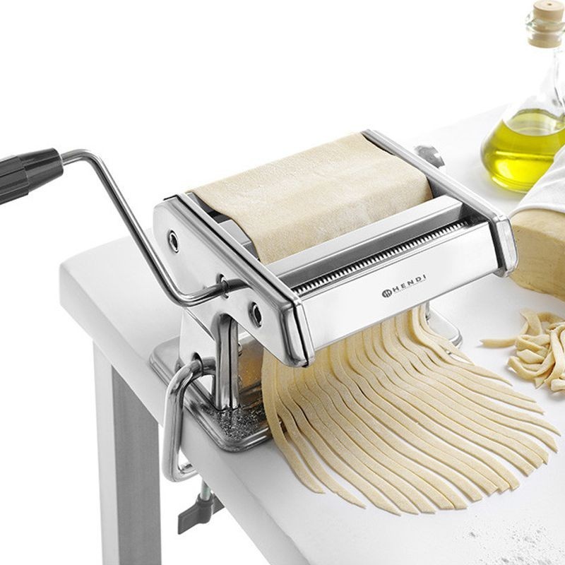 Ručný vaľkač cesta. Ideálny na prípravu čerstvých cestovín (maximálna šírka cesta 140 mm). Otočný ovládač nastavenia hrúbky cesta v 7 stupňoch od 0,2 mm do 2,5 mm. Tri valce/čepele z hliníkovej zliatiny: na vaľkanie cesta, cestovín tagliatelle a fettuccine. Disponuje kľukou a držiak na upevnenie na stôl.