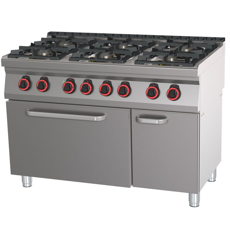 plynový príkon horákov: 2 x 3,5 kW + 4 x 6 kW, počet horákov: 6 ks, elektrický príkon rúry: 6,3 kW, vnútorný rozmer rúry: 680x550x300 mm, regulácia teploty rúry: 50-300°C, prevedenie rúry: statická, základné príslušenstvo:-rošt rúry GN2/1, hmotnosť 115 kg
