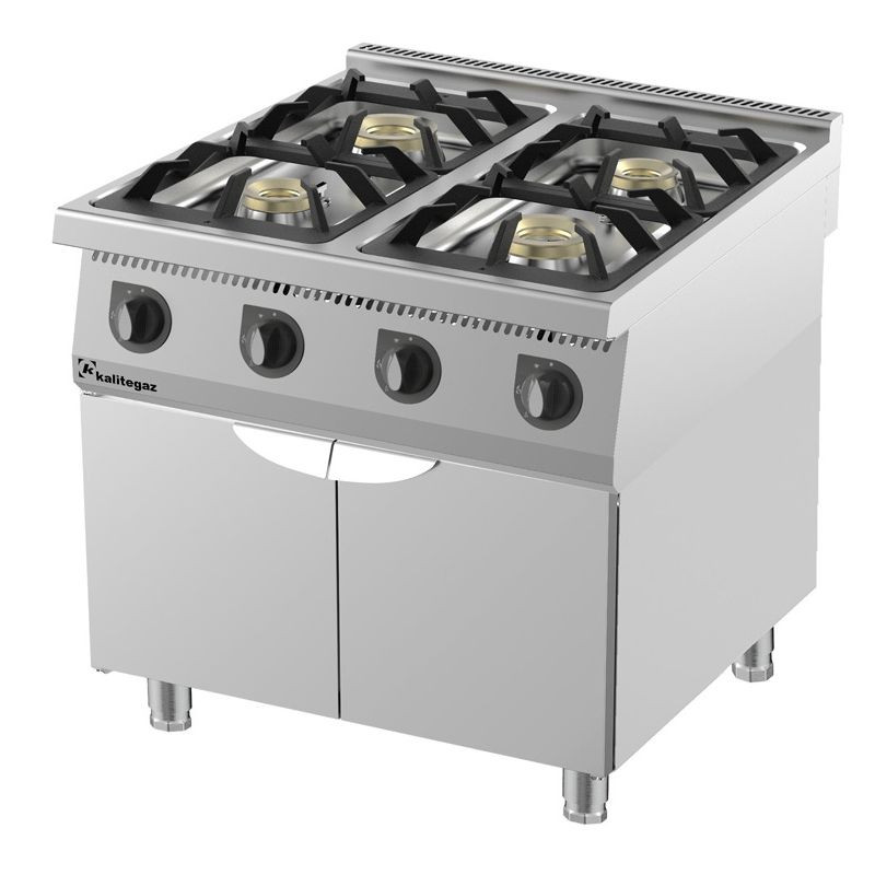 Plynový sporák 900 so 4 horákmi a dvierkami ▪ dostupné aj bez podstavca ▪ s horákmi 8 a 11 kW s pilotným plameňom ▪ vaničky pod horákmi sú odnímateľné a horáky rozoberateľné pre jednoduché čistenie ▪ dostupné aj v prevedení iba so slabšími alebo iba so silnejšími horákmi. Rozmery 800 x 900 x 900 mm, počet horákov 2x 8 kW/ 2x 11 kW, výkon plyn 38 kW, prípojka G20
