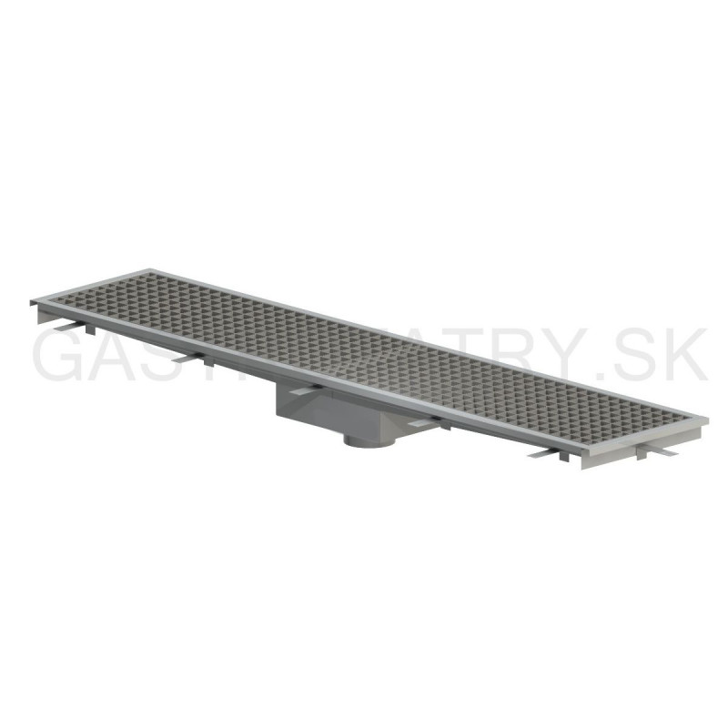 Podlahová vpusť, hĺbka 250 - 400 mm, šírka 500 - 2000 mm, výška vpuste štandardne 180 mm ▪ vývod z dola. Protišmykový rošt ▪ Rozmer odpadu Ø75 mm a Ø110 mm ▪ Vývod odpadu dole alebo do strany