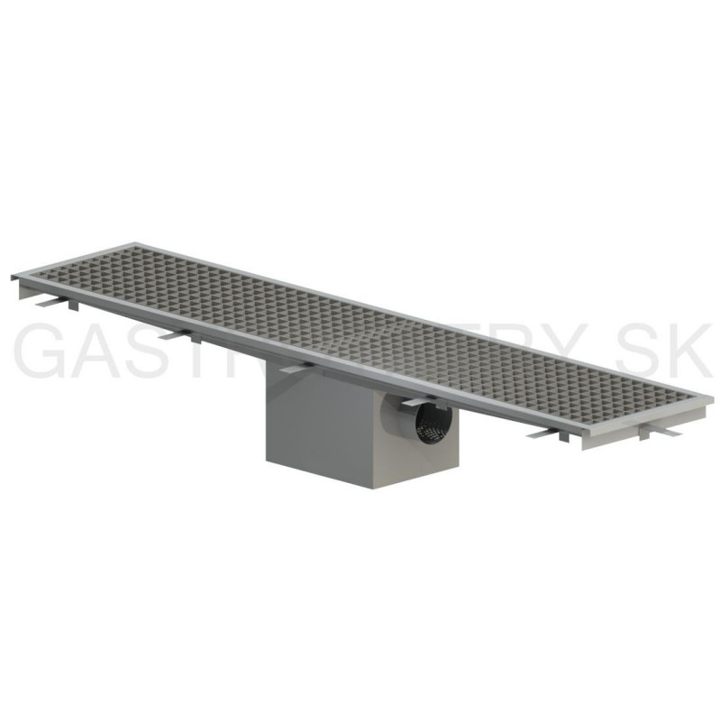 Podlahová vpusť, hĺbka 250 - 400 mm, šírka 500 - 2000 mm, výška vpuste štandardne 270 mm ▪ vývod z boku. Protišmykový rošt ▪ Rozmer odpadu Ø75 mm a Ø110 mm ▪ Vývod odpadu dole alebo do strany