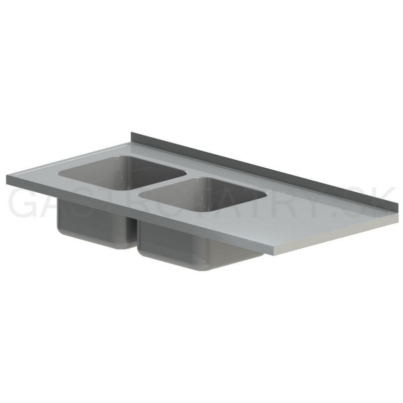 Pracovná doska prelisovaná - 2 drezy, hĺbka 600-700-800 mm, šírka 1100 mm - 2800 mm, hrúbka pracovnej dosky: 40 mm ▪ možnosť vyhotovenia bez zadného lemu ▪ otvor na batériu na vyžiadanie. Pracovná doska s drezom štandardne: - Prelis hlboký 3 mm - Drez lisovaný 400x400x250 mm - Bez otvorov na batériu