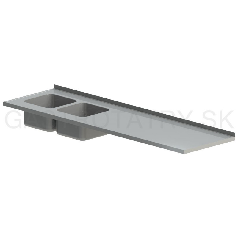 Pracovná doska prelis. s dvomi drezmi dlhá, hĺbka 600 - 800 mm, šírka 2900 - 4800 mm. Hrúbka pracovnej dosky: 40 mm ▪ možnosť vyhotovenia bez zadného lemu ▪ otvor na batériu na vyžiadanie. Pracovná doska s drezom štandardne: - Prelis hlboký 3 mm - Drez lisovaný 400x400x250 mm - Bez otvorov na batériu