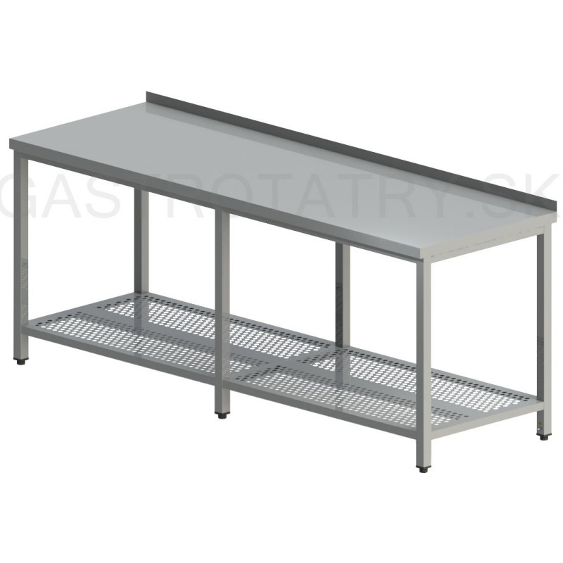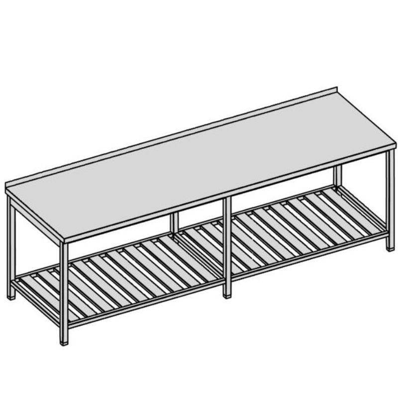 Pracovný stôl s roštovou policou dlhý. Hĺbka 600-700-800 mm, šírka 2000 mm - 2800 mm, výška stola štandardne 850 mm ▪ možnosť vyhotovenia bez zadného lemu ▪ roštová polica ▪ vrch police 150 mm od zeme ▪ nosnosť police 50 kg