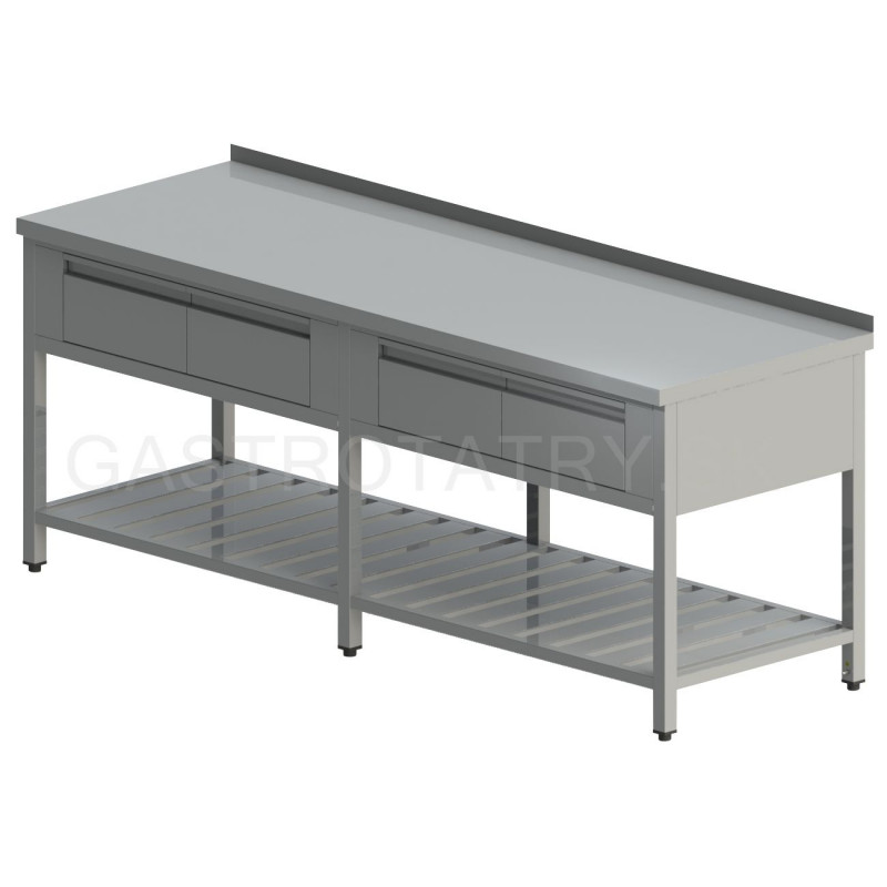 Pracovný stôl zásuvkový s roštovou policou dlhý, hĺbka 600 - 800 mm, šírka 2300 - 2800 mm, výška stola štandardne 850 mm ▪ možnosť vyhotovenia bez zadného lemu ▪ roštová polica ▪ vrch police 150 mm od zeme ▪ nosnosť police 50 kg ▪ 4x zásuvka