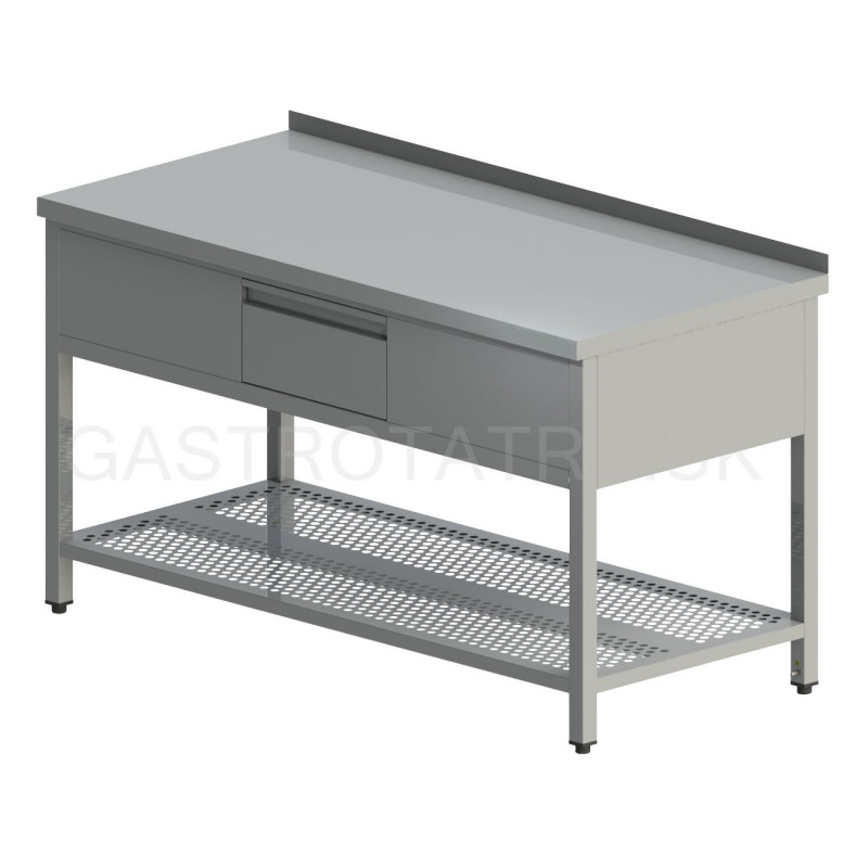 Pracovný stôl zásuvkový s perforovanou policou, hĺbka 600 - 800 mm, šírka 600 - 1900 mm, výška stola štandardne 850 mm ▪ možnosť vyhotovenia bez zadného lemu ▪ perforovaná polica ▪ vrch police 150 mm od zeme ▪ nosnosť police 50 kg ▪ 1x zásuvka