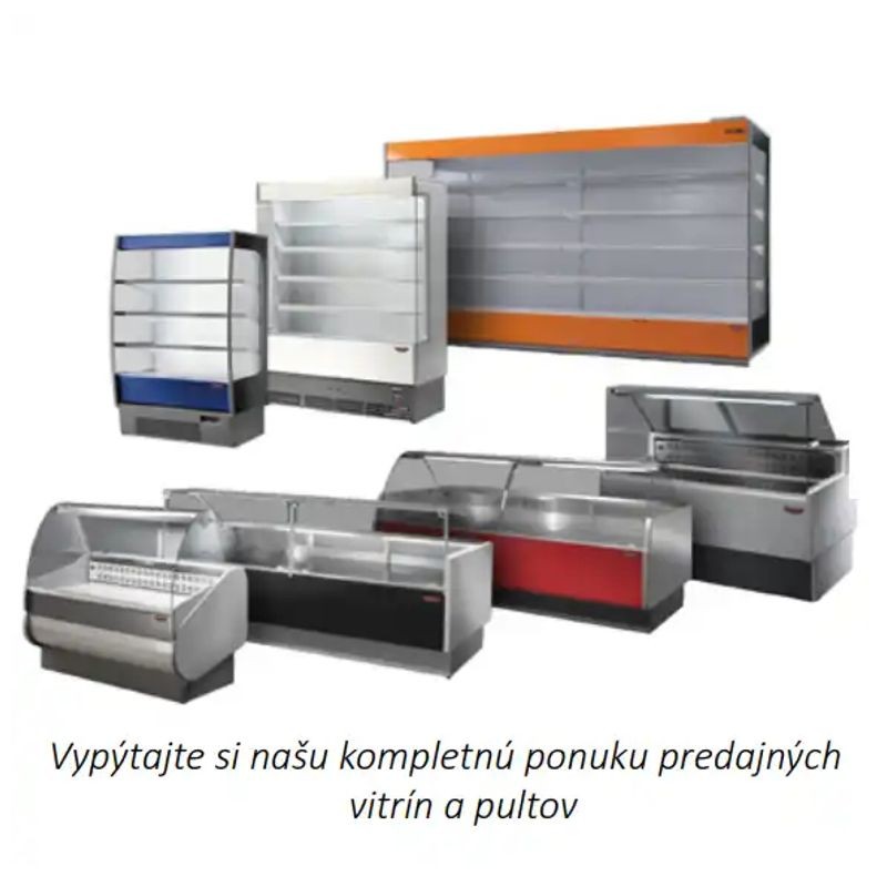 Predajná vitrína M80, rozmery 1520 x 900 x 1197 mm, výstavná plocha 0,93 m2, prípojka 230 V, príkon 0,62 kW, teplota: +2°C ~ +5°C (pri okolitej teplote +25 °C a 60% vlhkosti vzduchu)